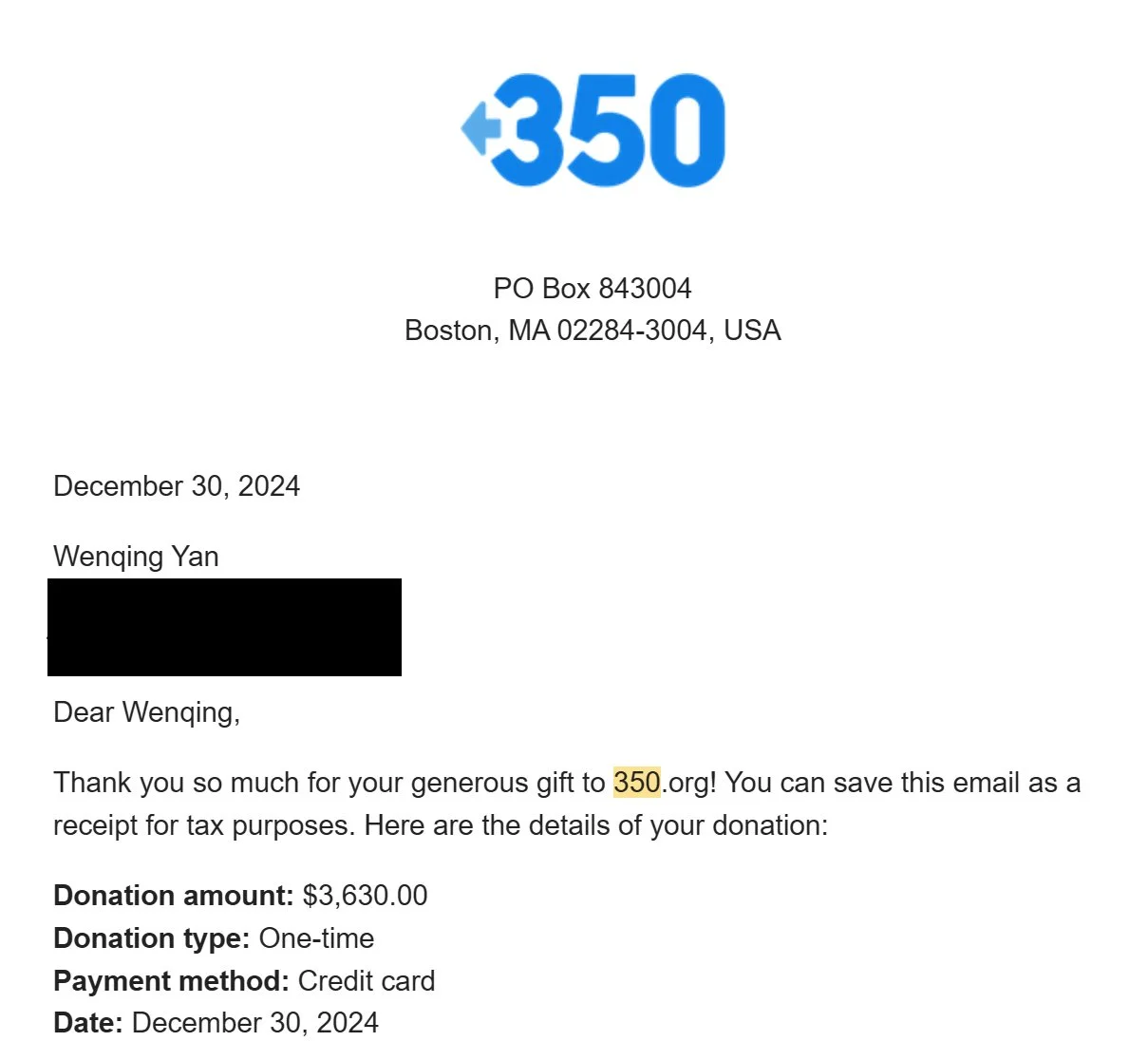 Without further ado, here are all the donation receipts so you can see which wonderful environmental charities your money helped support!